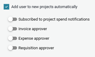 Turning on these toggles will automatically make the user available as an approver for these order types on all newly created projects.