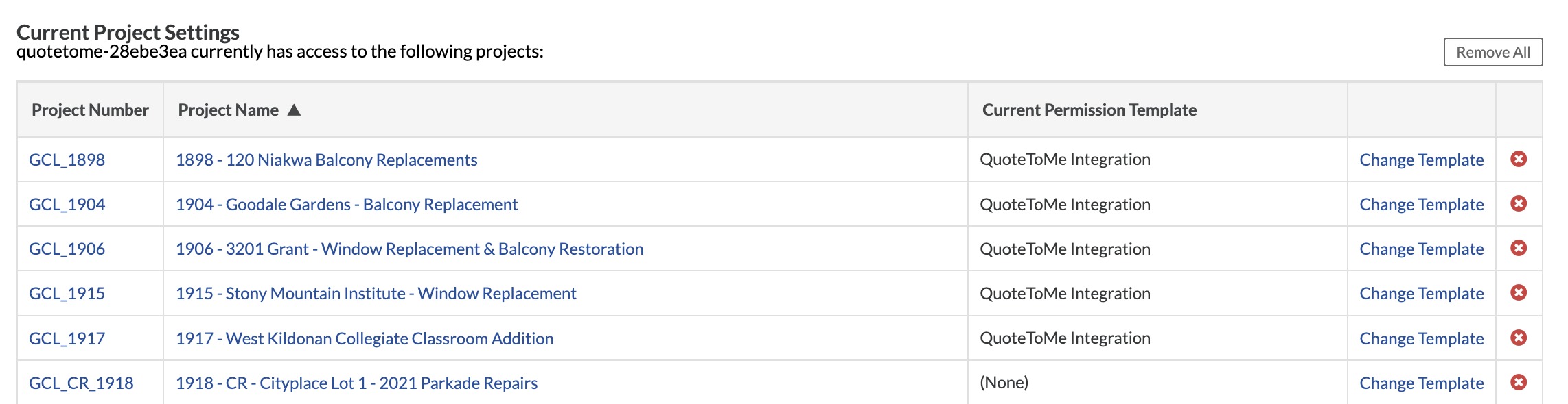 - For the projects listed, change the template to the QuoteToMe app integration: